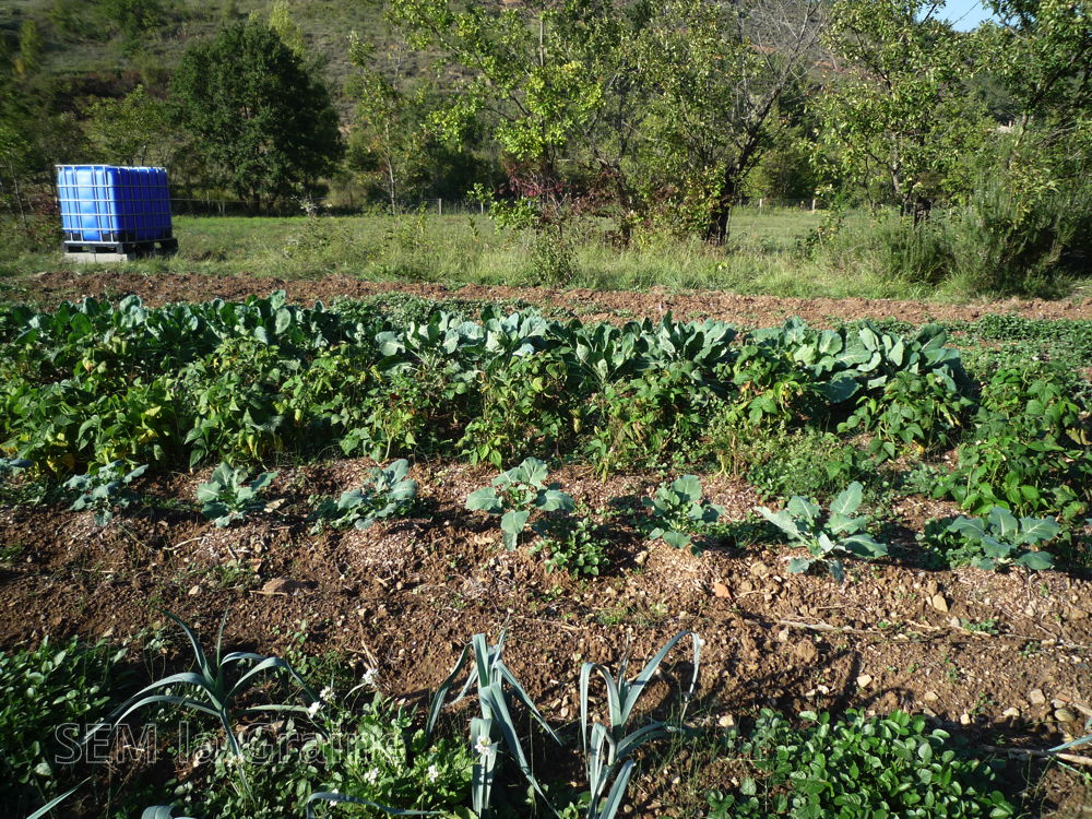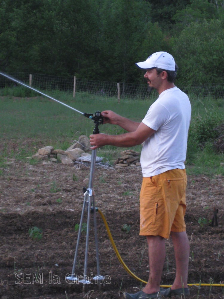Nous avons commencé par arroser à la main en allant chercher l’eau au ruisseau en contrebas. Cela nous prenait beaucoup de temps, puis nous avons fait des essais pour automatiser l’arrosage avec deux sprinklers.