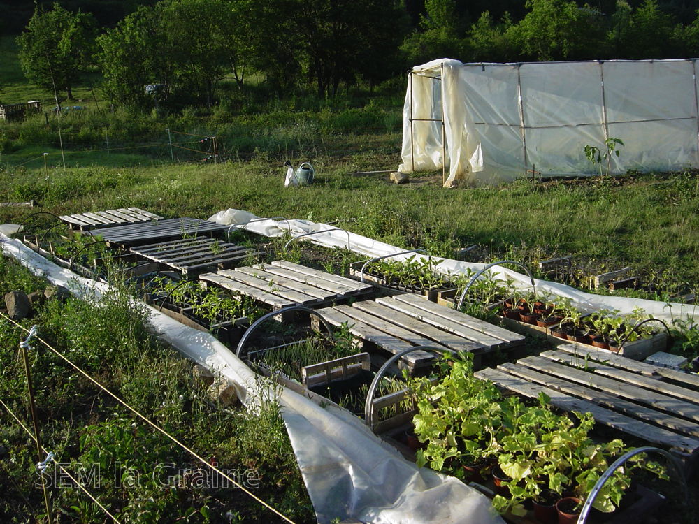 Afin de protéger les semis en début de saison nous avons créés des mini-tunnels avec quelques tubes, des palettes et des morceaux de bâche que nous avons récupérés.
