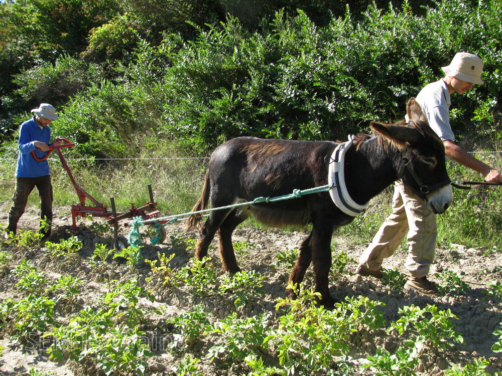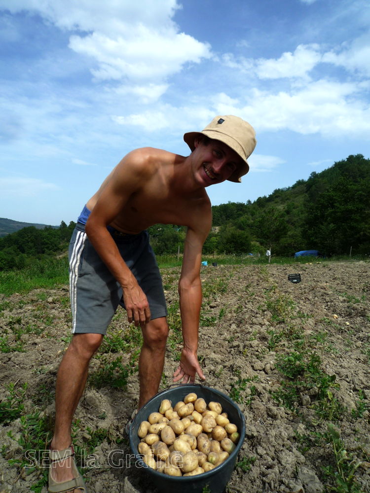 Il nous a fallut des heures et des heures pour obtenir enfin nos buttes à pommes de terre. Plantée tardivement nous avons tout de même eut une récolte permettant de retrouver des semences et des sacs de pommes de terre pour passer l’hiver.